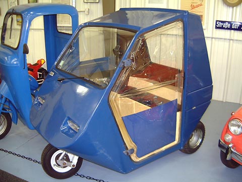 This example is the early 3-wheeled type 11, with power by Sachs "cyclomoteur" and two-speed automatic "Saxonette" drive. The 3 hp motor gave the 242 lb car a top speed of around 40 kph. A pick-up version, the "Super Pratique", with a small box over the rear wheels, was also available.A four-wheeled version, the Type 14 soon followed, with Motobecane 50cc engine.The car grew longer and heavier, and a BCB 125 cc motor became available on the Type 18.