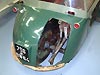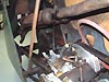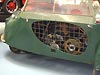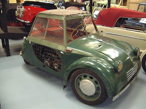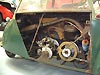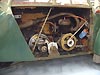 A disparate collection of parts make up the drivetrain. The motor is a British Villiers Mk. IX, allegedly out of a BSA motorcycle. The Roman numeral designation was used by Villiers prewar, and the Mark IX Series 'A' dates from 1926. A separate gearbox from a French Renee Gillet motorcycle is driven by chain. A separate starter motor is connected by a leather link-belt. The clutch is connected by three belts, and there is chain drive to the rear wheel. Suspension is by leaf spring- longitudinal at the rear and transverse in front. Steering is by direct link to the steering arms. More BSA parts are used throughout.