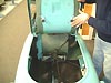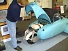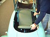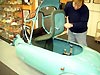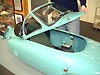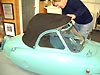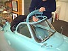 He designed and built his little car using as a base the body of a Steib S250 sidecar, turned back to front, split down the middle and widened. The windshield and front suspension is Messerschmitt, and the drive unit Heinkel Kabine 150 (175cc), but with 103A-0 Tourist carb and exhaust. The 8-inch rear wheel and shorter chaincase came from the Tourist scooter 102A-1. The unique steering, U-shaped handlebars pivoted under the seat, is a delight to use- light and precise. Handlegrips conveniently incorporate blinker switch and horn button. Canopy, tail, seat and fuel tank all pivot upwards for access.