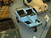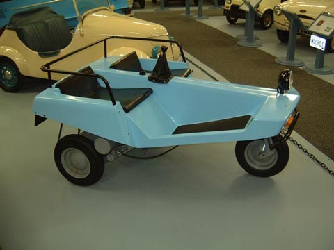 This unusual vehicle was introduced in 1969 as  "a revolutionary new means of locomotion adapted to the constraints of todays lifestyle, for short hauls of 50m to 50km, for use by one or two people".  It was "electronic" as opposed to "electric" and its main feature was its use of a single central "joystick" that performed all functions: acceleration, deceleration, braking and steering. The control was called the Stil- after the classical Greek column- a symbol of purity, simplicity and elegance. Designed by the brothers Jarret, for their company La Societe Voiture Electronique, it featured complex modern electronics controlling a pair of special electric motors- one at each wheel. By varying the current, one wheel turned at a different rate than the other- providing steering. The front wheel simply trailed along. The strangely-named Porquerolles was followed by the CAB, essentially the same vehicle with a rudimentary roof and 60 volt electrics, and then by the COB, with a full body, 96 volt electrics, and finally a normal steering wheel. Manufacturer: Societe La Voiture Electronique, France