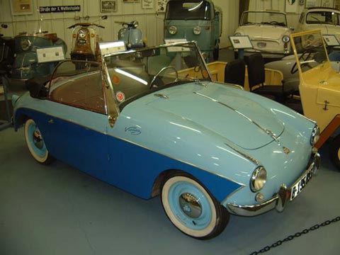 After a lengthy 2-year development period, the prototype appeared in 1956, featuring an in-house 250cc motor with aluminum piston and head, which drove the rear wheels. Independent front suspension, large diameter wheels and snug, enclosed bodywork even allowed discussion of driving comfort- a subject not remotely considered by a Biscuter driver.